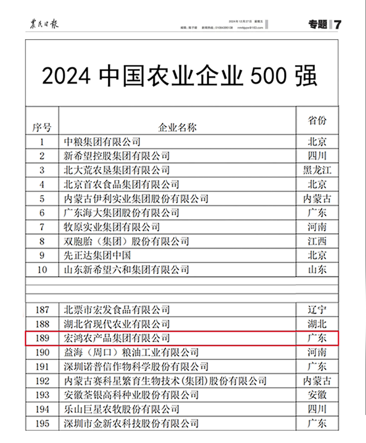 宏鸿集团蝉联“2024中国农业企业500强”,排名大幅提升
